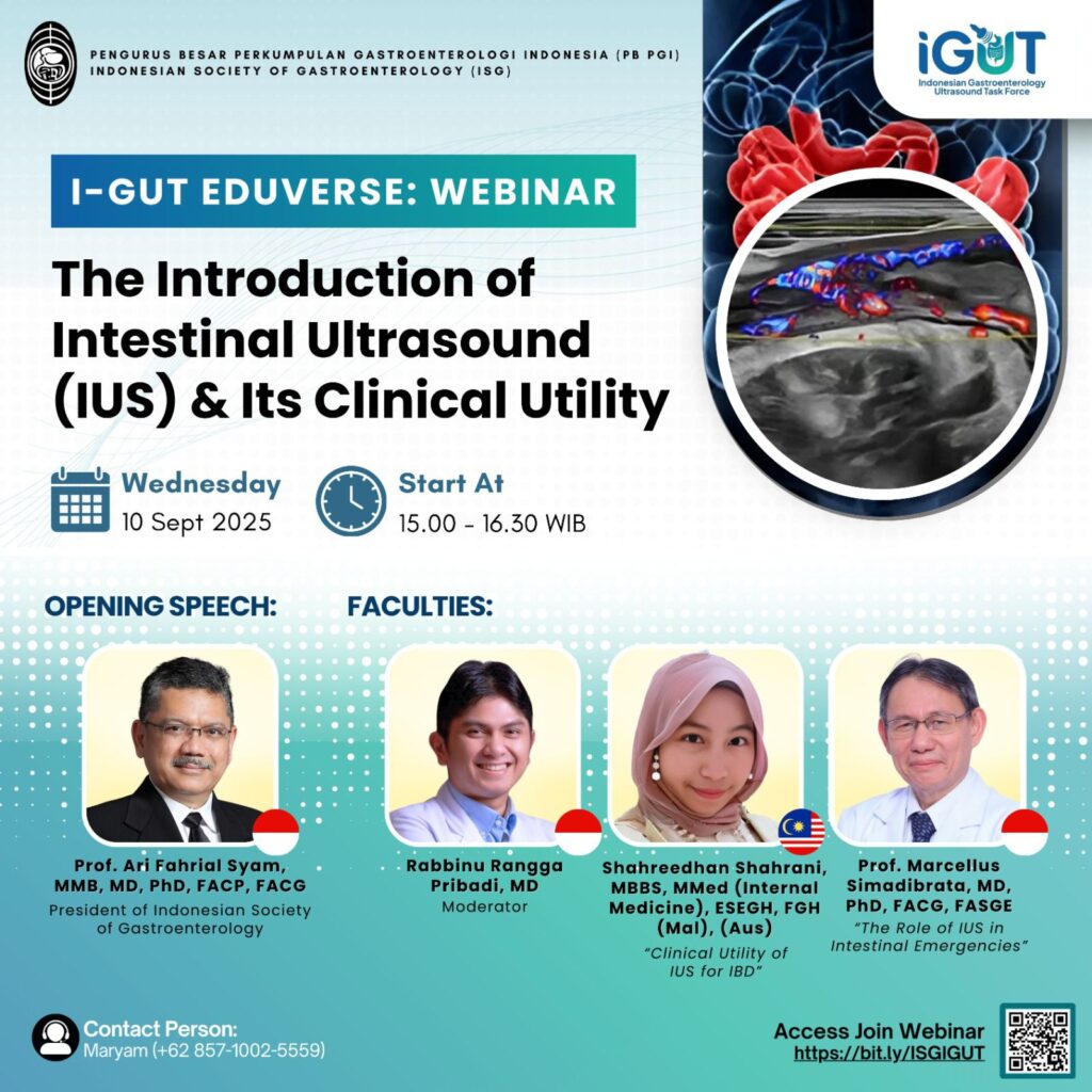 The Indonesian Society of Gastroenterology and its working group: Indonesian Gastroenterology Ultrasound Task Force (I-GUT) proudly present the first I-GUT Eduverse Webinar “The Introduction of Intestinal Ultrasound (IUS) & Its Clinical Utility”